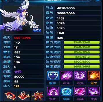 下面唠唠嗑,说说潜能怎么用,比如九尾把你把禁疗顶掉了,想顶回来。暂时九尾技能为高级敏思 法魂和其他A技能,你用潜能就出禁疗和法盾其中一个技能,至于掉哪个就是随机了,宠物成长方面影响不是特别大,不必过分在意。资质相对来说更重要。变异资质会突破上限,更容易出现好的宝宝。神兽方面 目前法猴 法机 法兔子等都是大热门,也看个人喜好吧,有些小伙伴不喜欢PK,喜欢带麒麟也可以。有条件可以开天命,会多个技能。到85级 95级更有特色宠物天女、尊者、大圣、炎魔等待你去发掘!