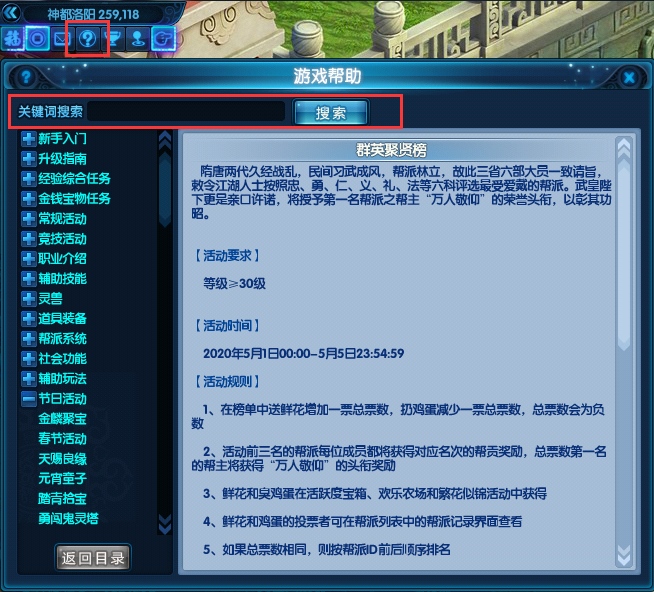 活动时间:2020年5月1日-5月5日,详情可查看游戏内帮助:群英聚贤榜