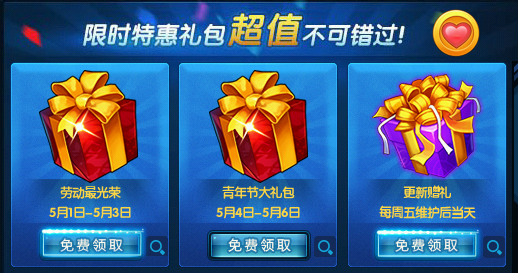 4、五一贴心礼包:福利中心-贴心礼包内增加五一金蛋、金蛋2送3、五一休闲特惠包、劳动光荣超值包、劳动钜惠狂欢包、五福临门美满包等超值礼包,金蛋有概率开出全新神体特效晶石-金色童话晶石、三级灵晶礼盒、一级珀光珠、狱火狻猊之魂、珍兽魂任选包、万灵玉等。五一休闲特惠包更有“风雨同行桃花秀”免费赠送,劳动光荣超值包、劳动钜惠狂欢包、五福临门美满包更是超值特惠,此时不买更待何时!