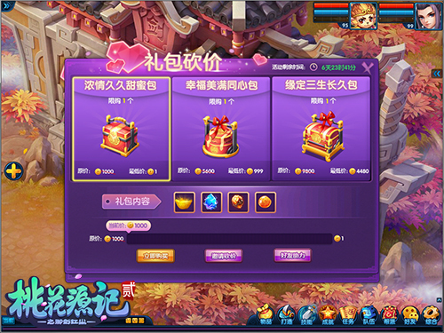 单身固然可庆,剁手更不能停!在举国同庆天猫狂欢的时候,《桃花源记2》双十一特色砍价礼包活动来袭!价值千金的礼包,通过邀请好友进行砍价,仅需1金就可到手哦!通过邀请好友助力,不仅可以获得超强实惠,还能增进小伙伴们之间的友谊,一举两得,赶快行动吧!