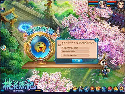 来自西域神秘国度的魔镜,能够照妖识魔,亦能够看透人性!《桃花源记2》特色清明活动魔镜奇缘,将通过一块神秘魔镜,揭开少侠内心深处的真实模样!小伙伴们参与活动后,只需回答出魔镜所提出的一系列趣味问题,即可顺利通关!任务完成后,小伙伴们还会根据系统测算出的真实性格而变幻成各种不同的游戏造型哦!好玩又有趣,自在闯桃源!
