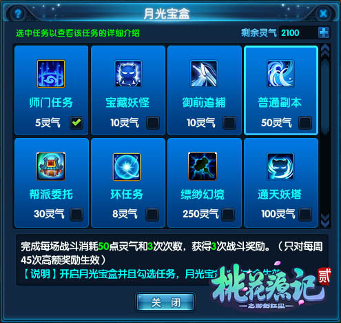 国产新派回合网游《桃花源记2》全新技能“月光宝盒”全面开启,小伙伴们完成推荐任务即可获得“月光宝盒”技能,开启月光宝盒后手动完成一次任务,月光宝盒将消耗一定数量的灵气值自动帮你也完成一次!只用做1次任务,就能完成2次任务的量,奖励还一点都不少,这样方便快捷的技能赶快用起来吧!