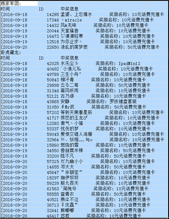 在此,我们恭喜以上获奖玩家,获得罗技键鼠套装以及话费充值卡奖品,请中奖玩家尽快联系客服提交信息,便于我们联系您发奖。
