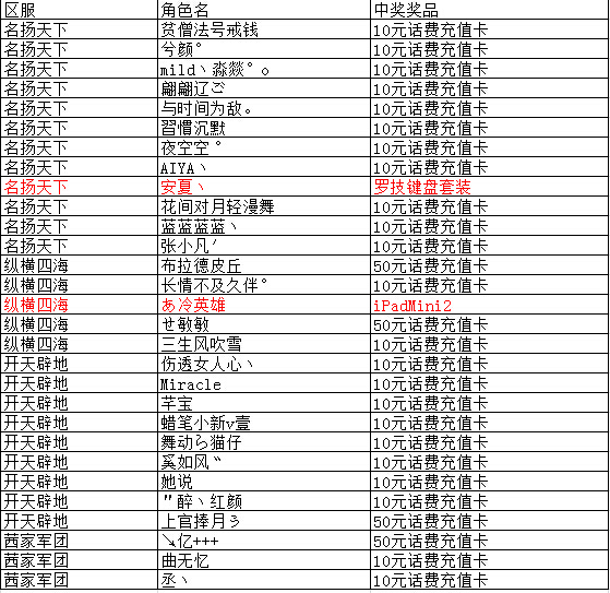 在此,我们恭喜以上获奖玩家,获得iPad mini、罗技键鼠套装以及话费充值卡奖品,请中奖玩家尽快联系客服提交信息,便于我们联系您发奖。