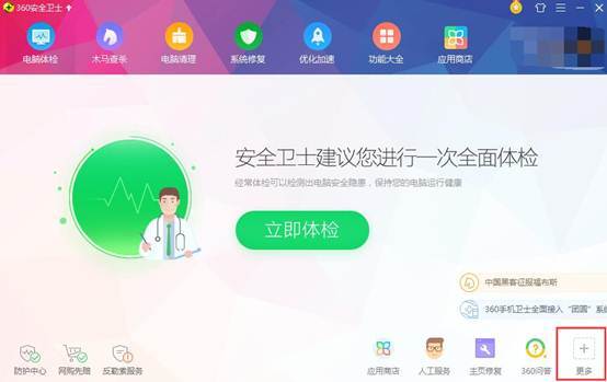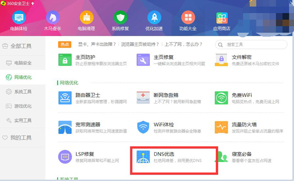 说明:在安全卫士界面点击右下角“更多”→选择“网络优化”→点击“DNS优选”根据提示完成操作。