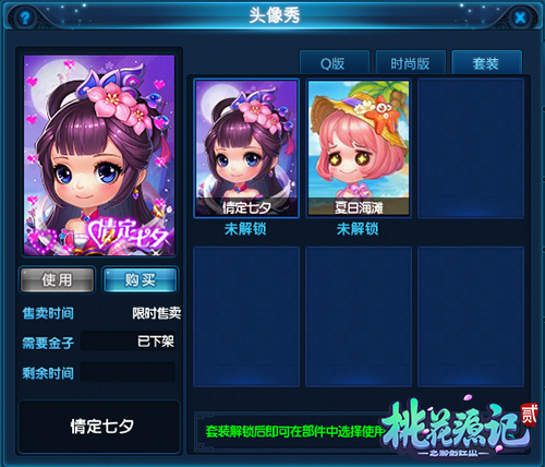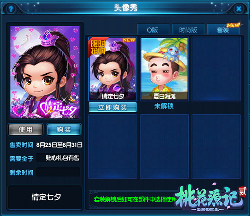 时值七夕佳节,又到了情侣们虐狗的日子,没有一套亮丽的情侣装怎么能行呢?《桃花源记2》全新七夕桃花秀套装“情定七夕”华丽登场,套装整体以紫色为基本色调,背景则以浪漫月夜为底,同时搭配闪动的心形边框特效和人物天然萌的表情,使得整体看上去十分光彩夺目!这样的节日里,不妨赶快入手送给你心仪的ta吧!