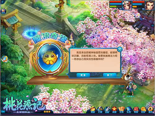 来自西域神秘国度的魔镜,能够照妖识魔,亦能够看透人性!《桃花源记2》特色清明活动魔镜奇缘,将通过一块神秘魔镜,揭开少侠内心深处的真实模样!小伙伴们参与活动后,只需回答出魔镜所提出的一系列趣味问题,即可顺利通关!任务完成后,小伙伴们还会根据系统测算出的真实性格而变幻成各种不同的游戏造型哦!好玩又有趣,自在闯桃源!
