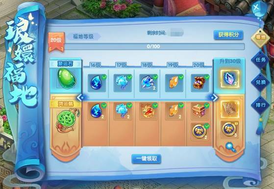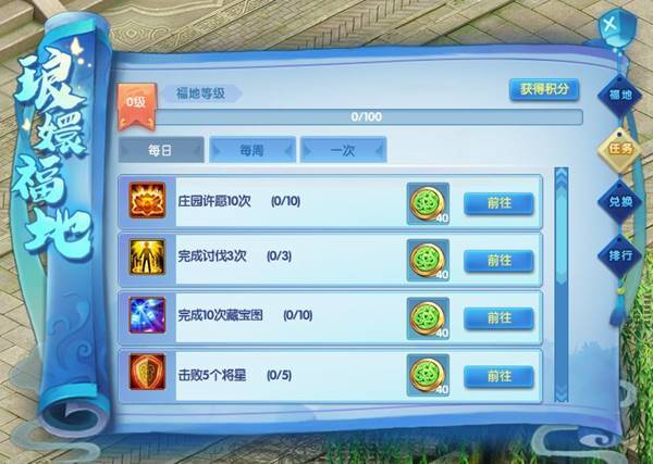 琅嬛福地发布每日任务、每周任务和一次性任务,完成任务可获得琅嬛积分,升级福地等级,获取大量奖励,50波不同奖励,让你天天有惊喜!
