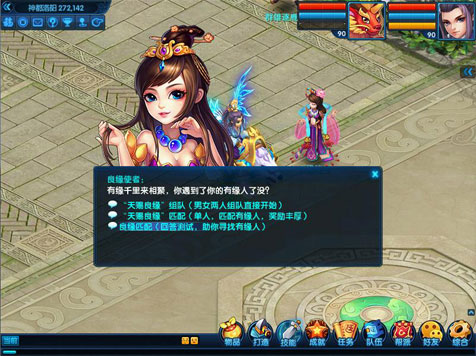 2. 完成良缘匹配测试后与神都洛阳“良缘使者”(281,140)对话后,可进行匹配入场。或自行组队入场。