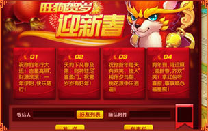 4、完成4个NPC的拜年,可来春节使者处提交任务,获得经验、福帖和春节贺卡,贺卡可以发送给好友哦!
