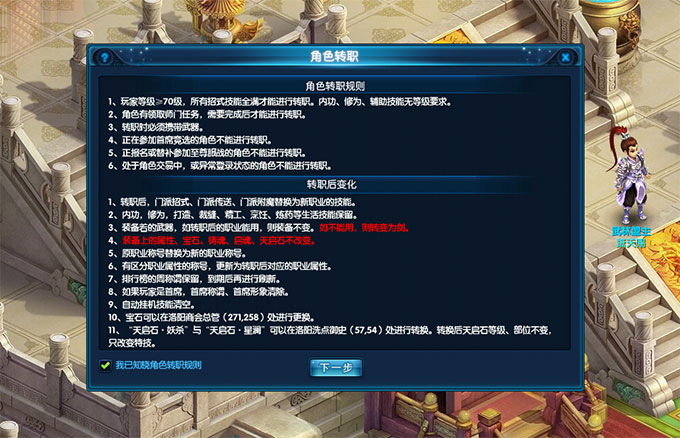 6、处于角色交易中,或异常登录状态的角色不能进行转职。