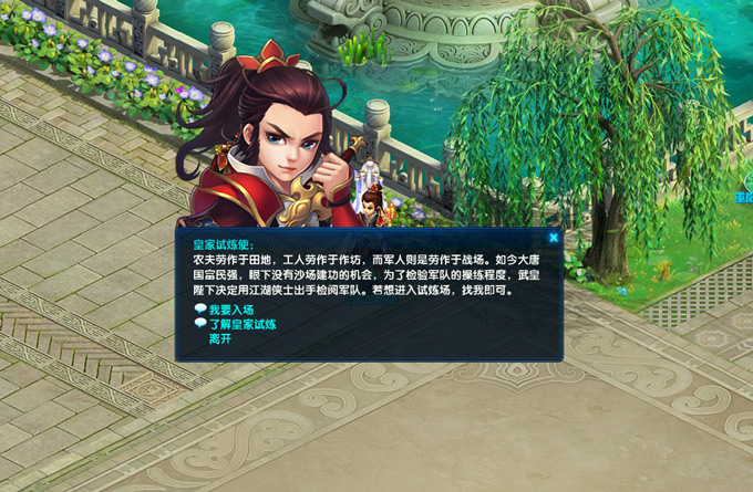 农夫劳作于田地,商贩劳作于街市,工人劳作于作坊,而军人则是劳作于战场。如今大唐国富民强,吐蕃、南诏、突厥、百济、新罗、高句丽等国莫不臣服,眼下没有沙场建功的机会,他们的劳作便表现在校场操练之中。为了与民同乐,也为了检验军队的操练程度,武皇陛下决定用江湖侠士出手检阅军队。国家兴亡,匹夫有责,请诸位大侠务必打起精神,万万不可松懈,协助陛下缔造一支铁血王师。