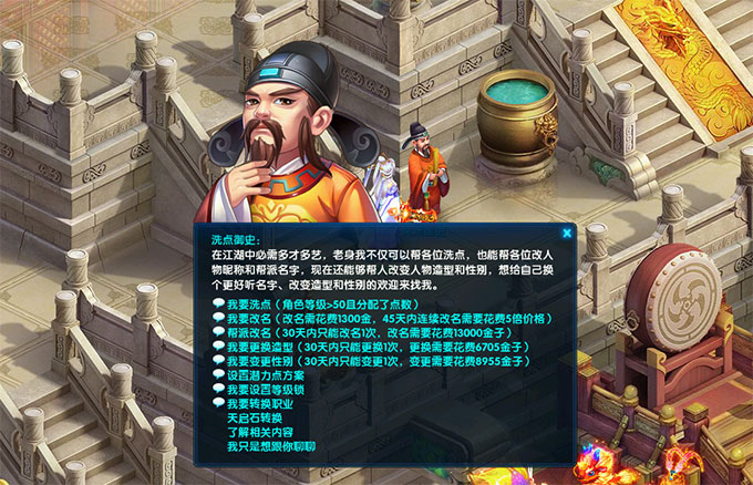 初入江湖,难免对职业了解程度不够。如果你想体验其他职业,可以到“洗点御史”这里转换门派,迈向新的人生巅峰。