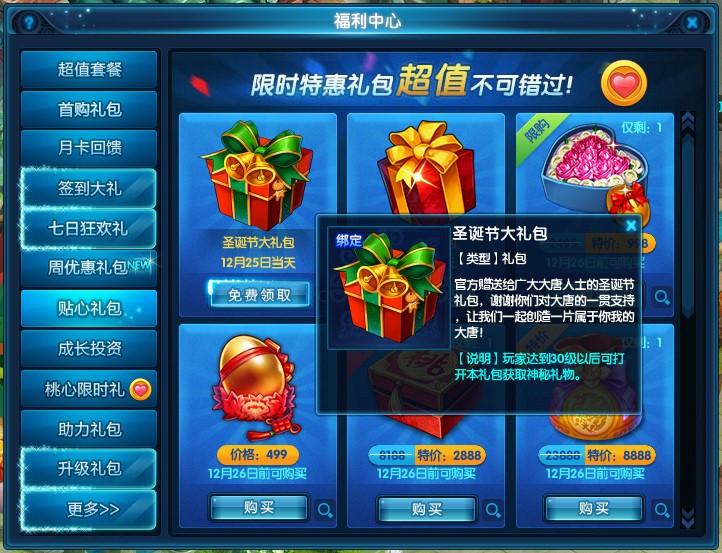 - 活动当天,上线即可前往福利中心-贴心礼包界面,免费领取圣诞限时超值礼包,优惠多多不要错过!